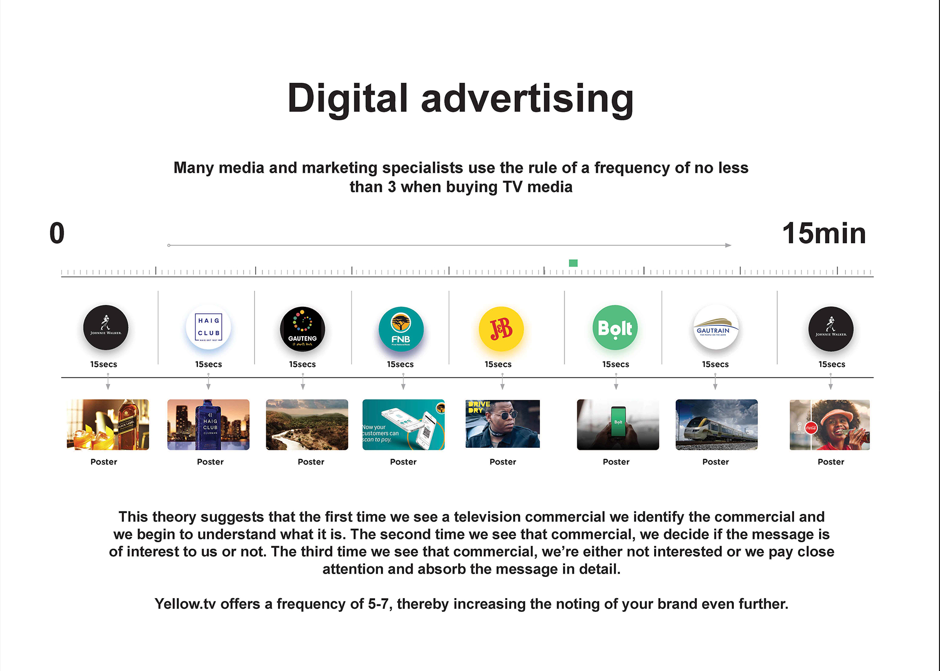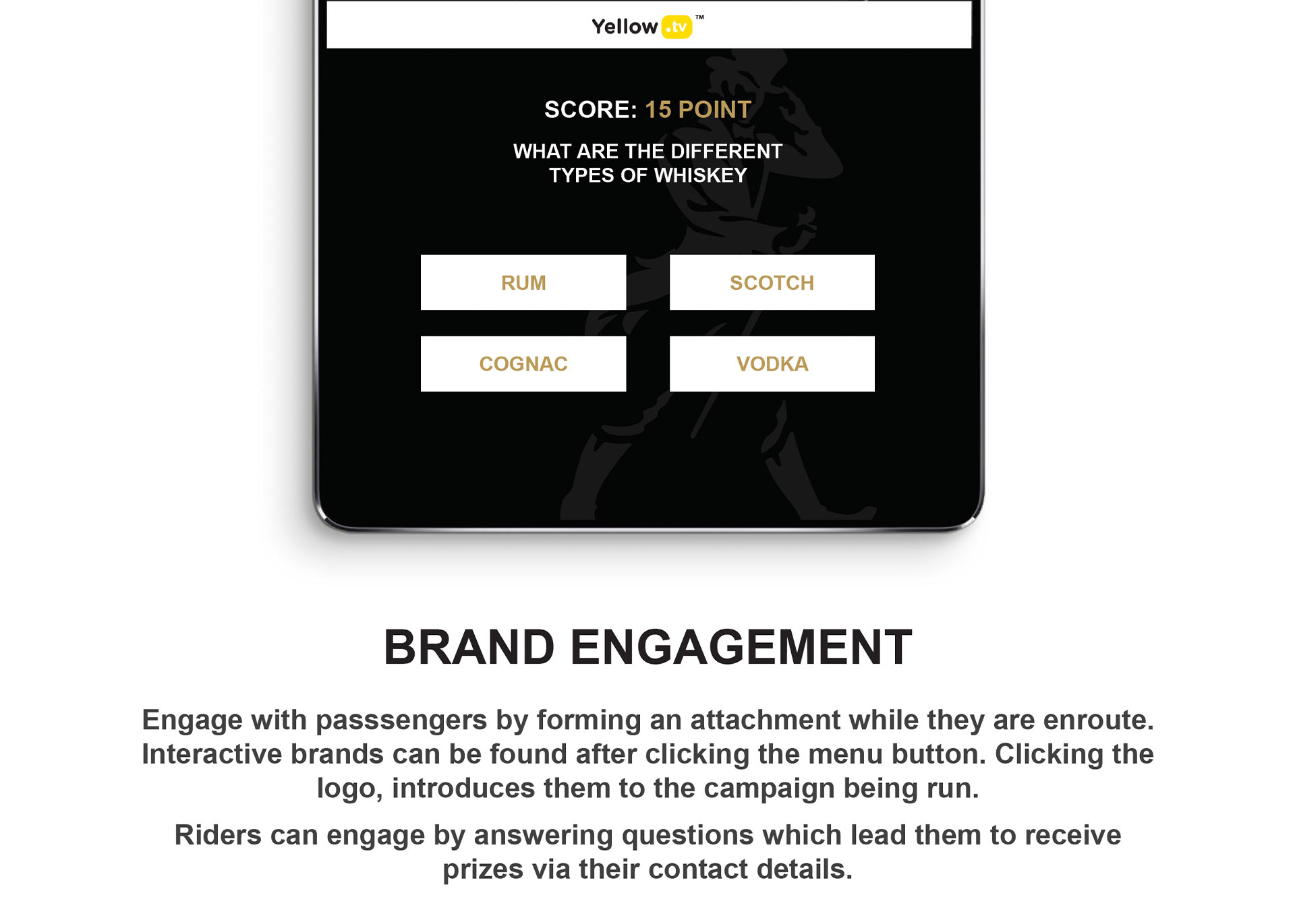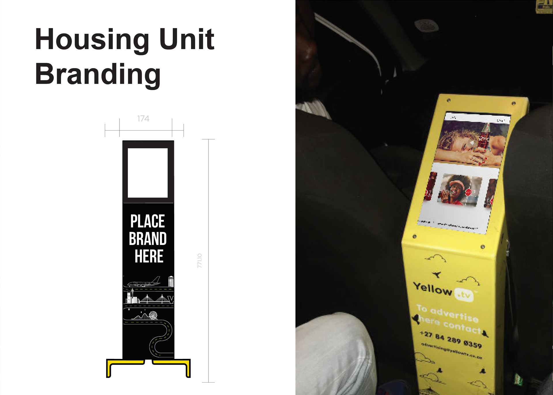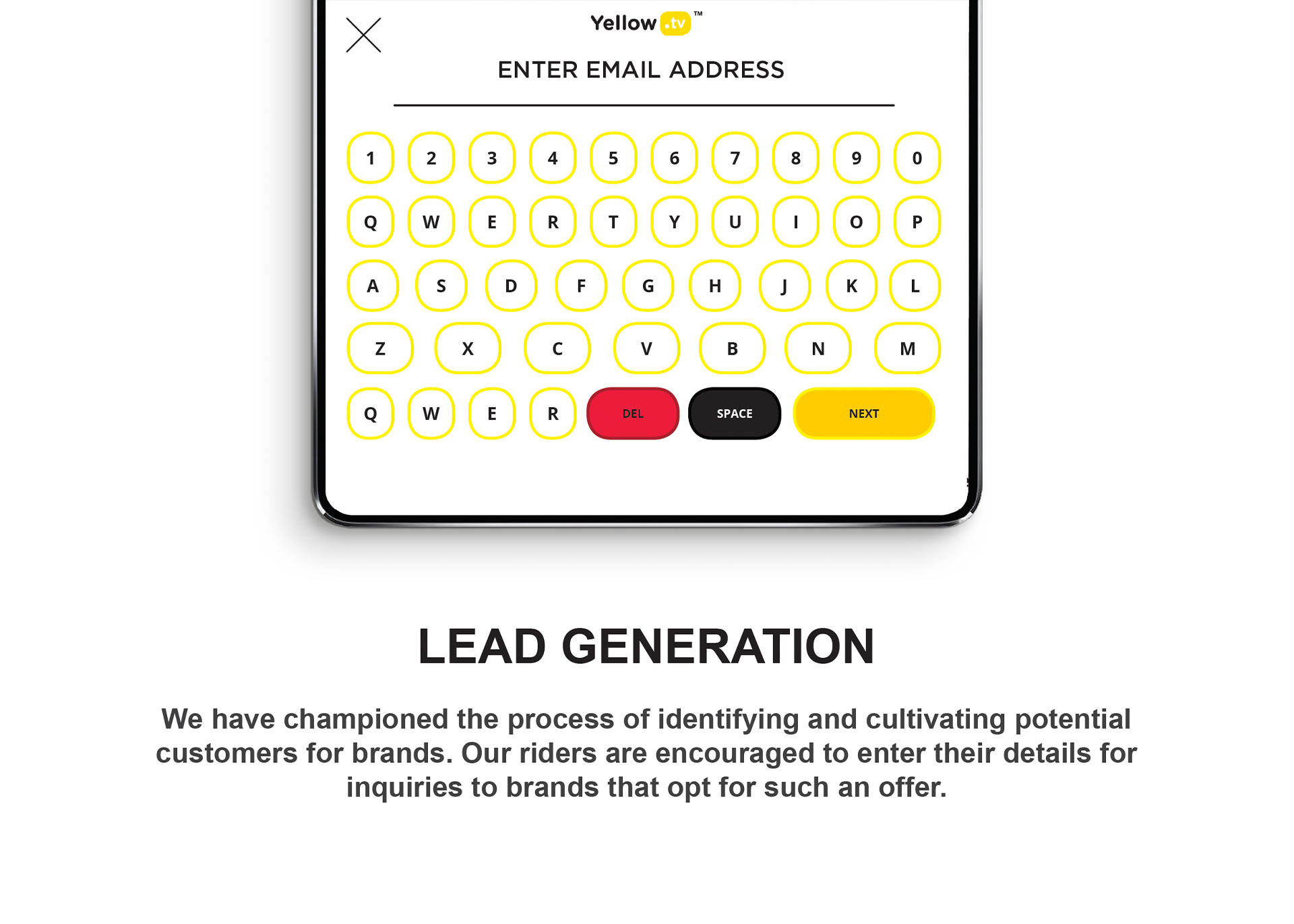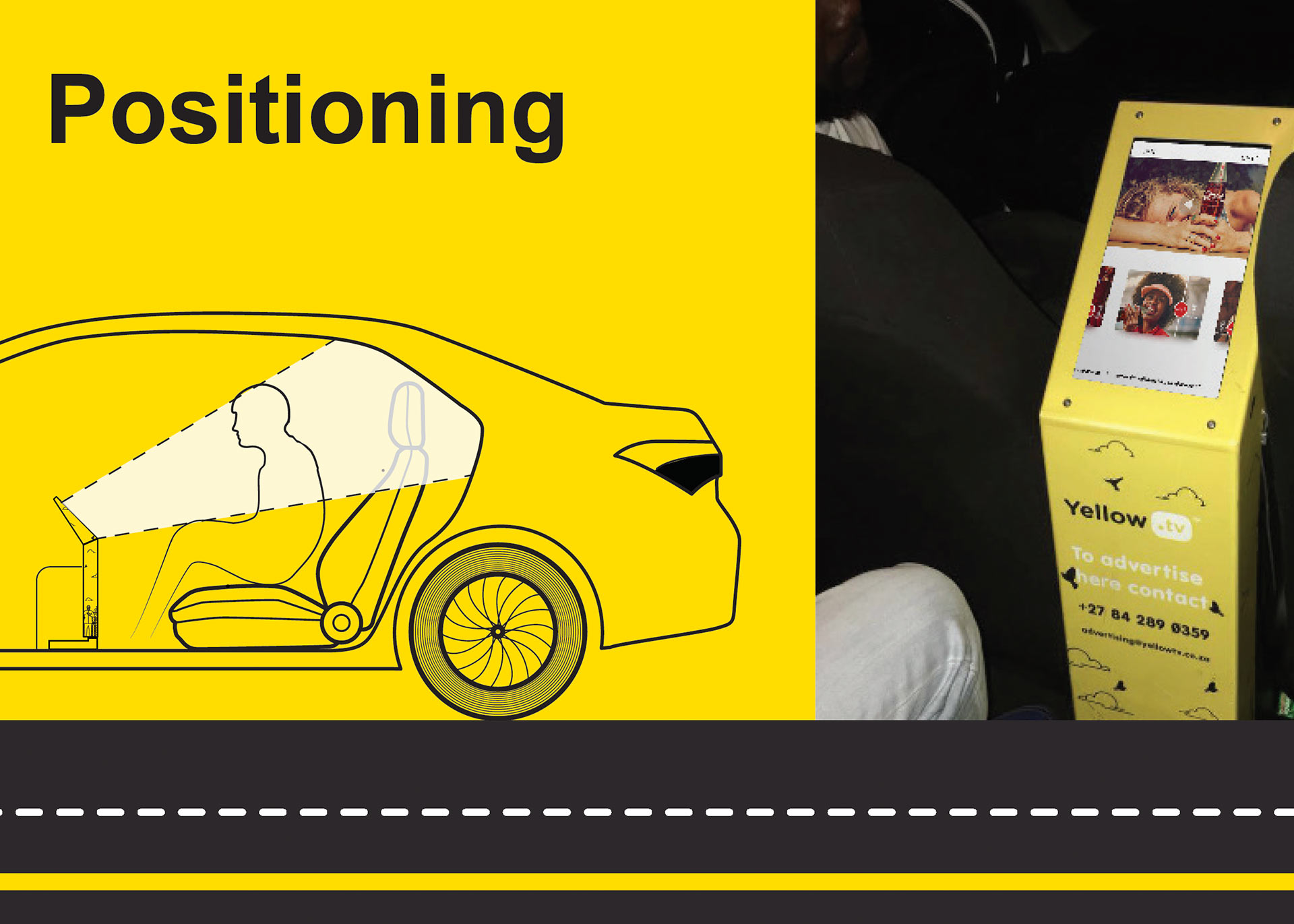 Yellow.tv is a ride share advertising platform that connects brands to LSM 4-10 in South Africa. It digitally showcases quality brand content to a quality audience which exists in ride-share vehicles. The purpose is to offer a higher value brand experience for people moving from one destination to the next.