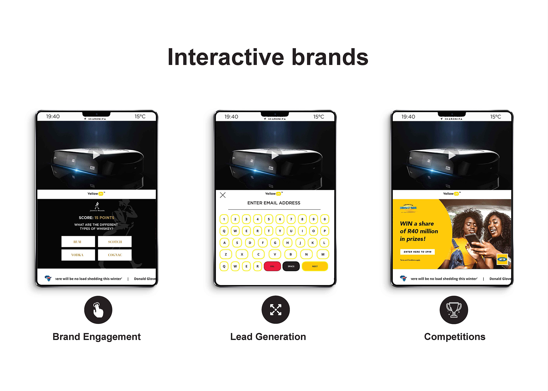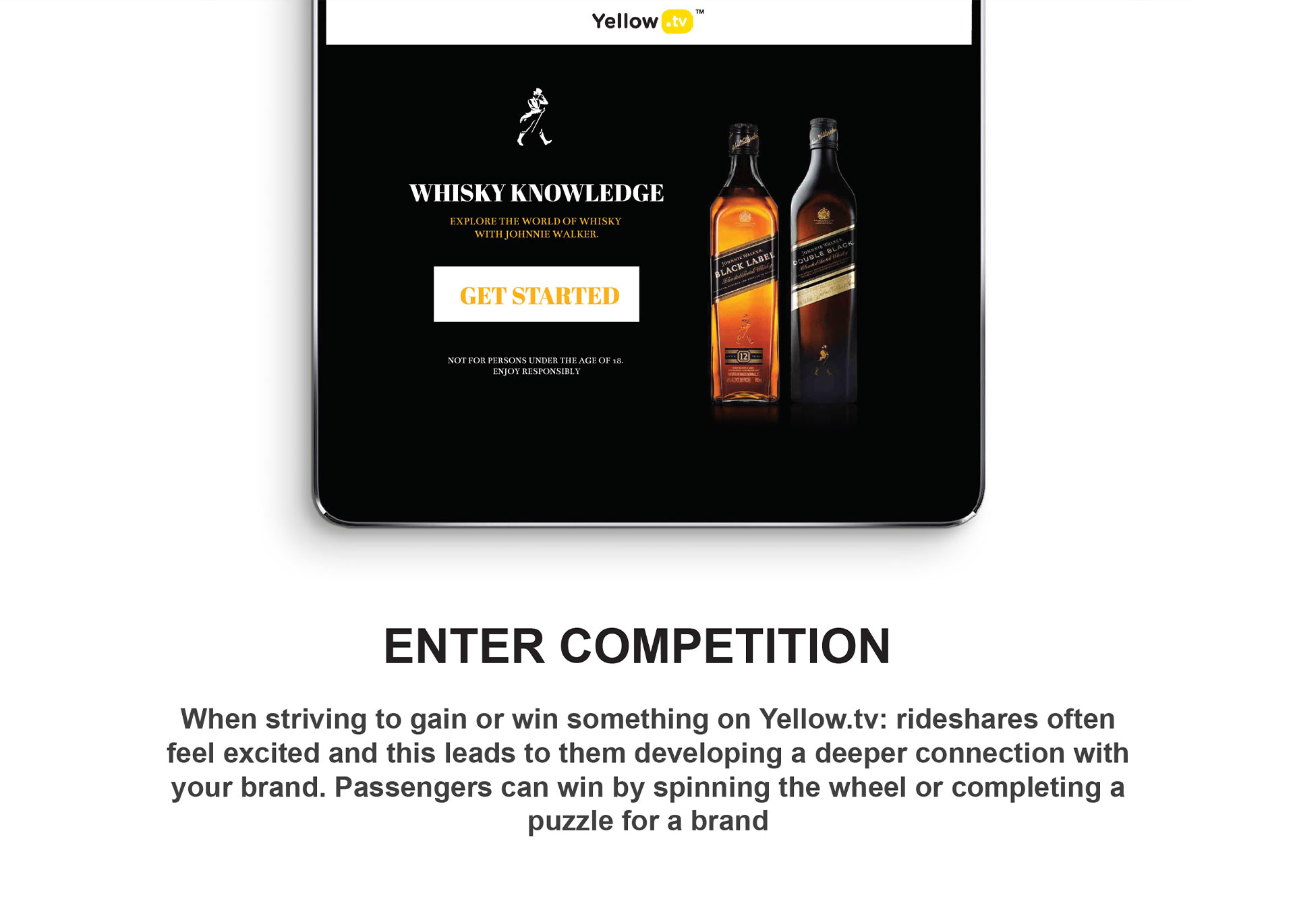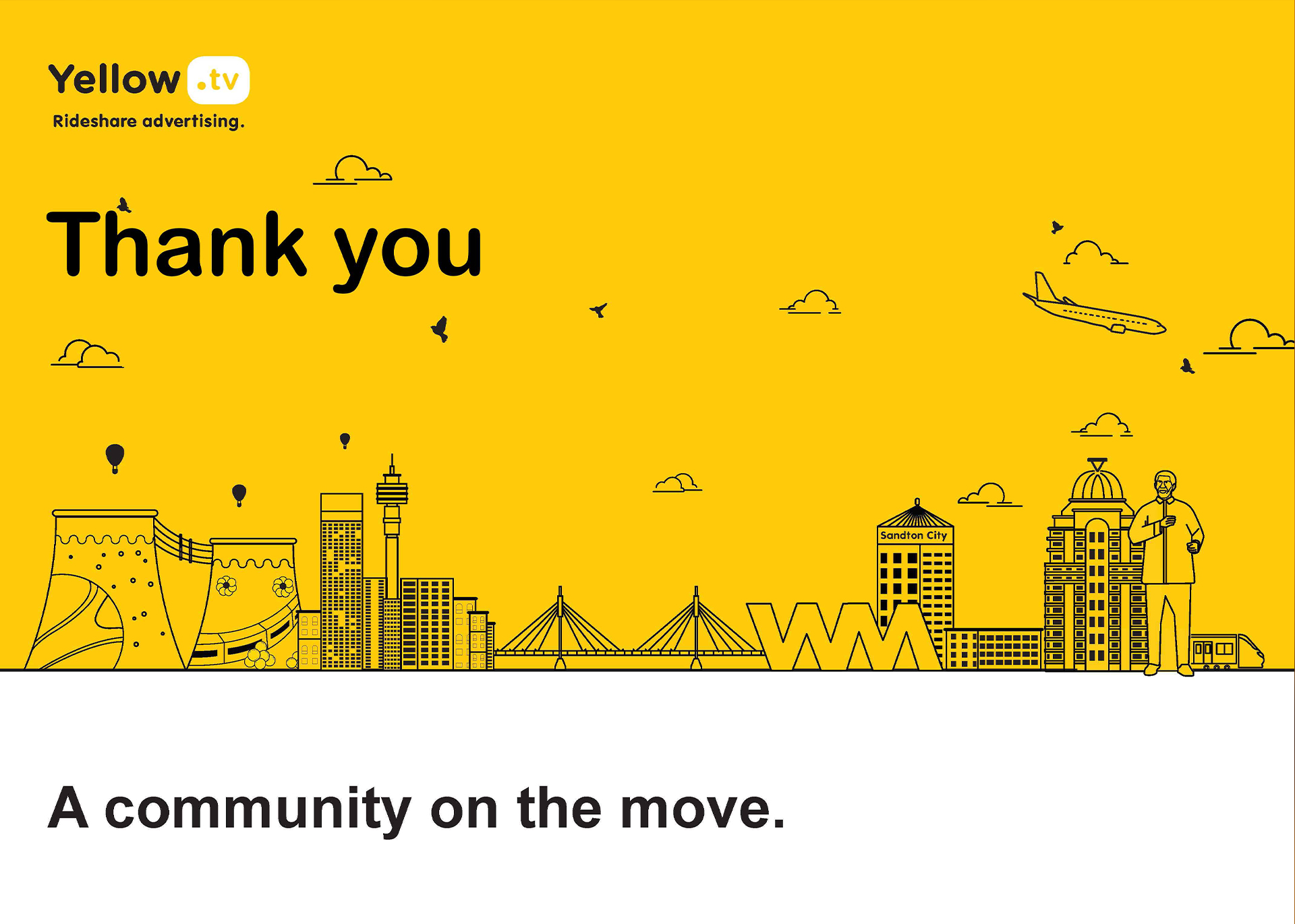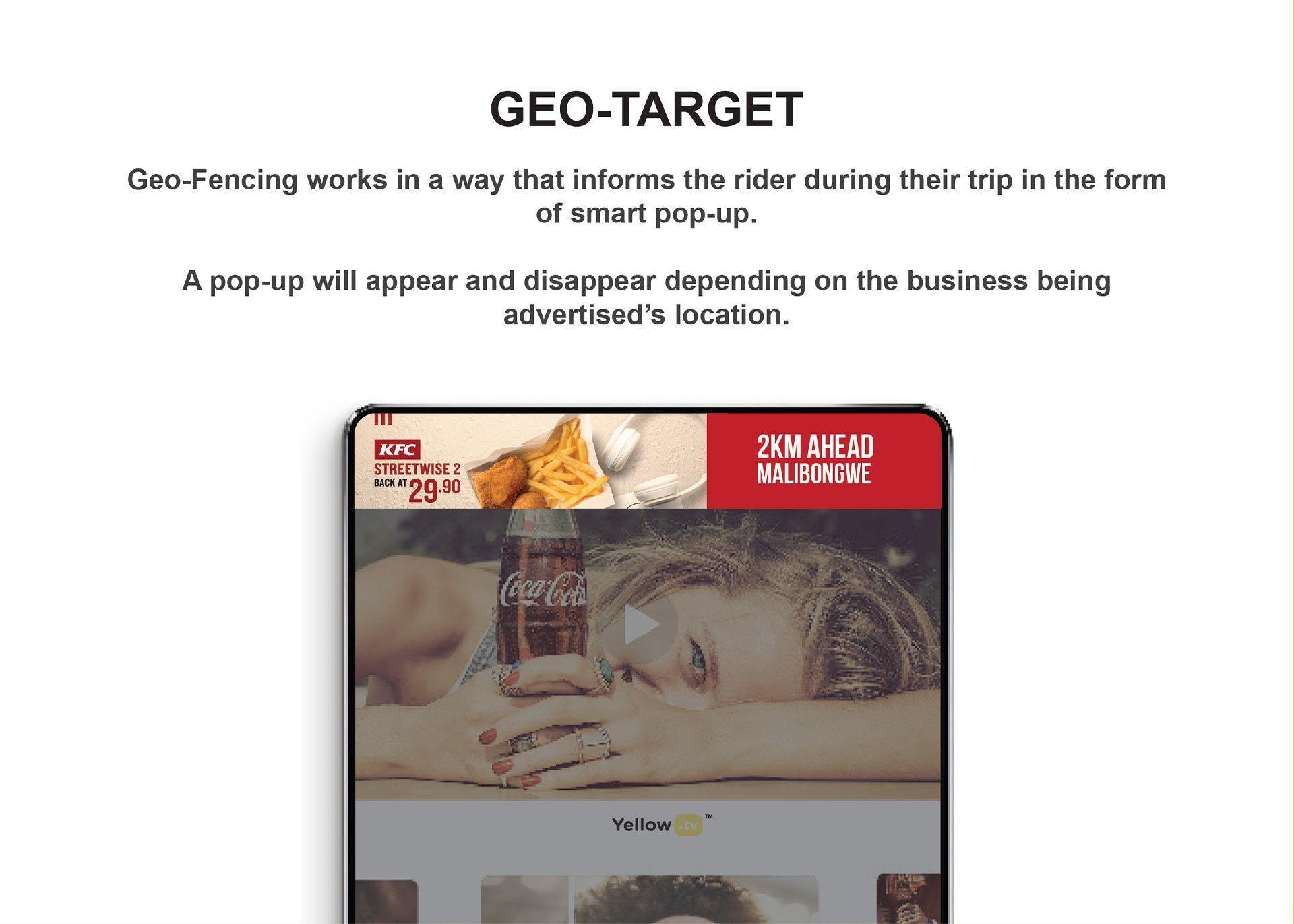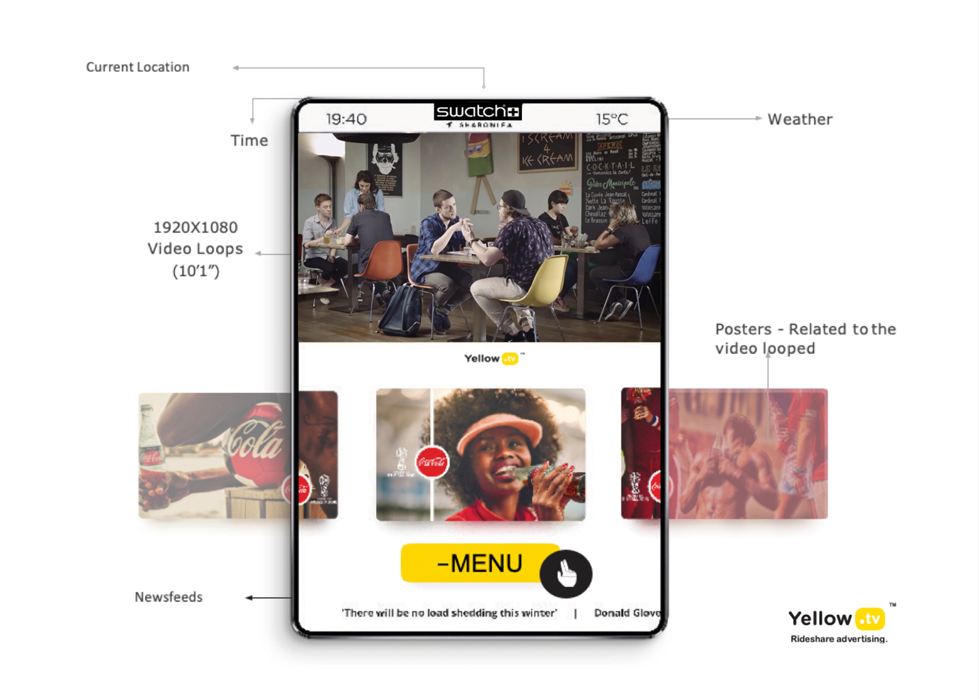 Yellow.tv is a ride share advertising platform that connects brands to LSM 4-10 in South Africa. It digitally showcases quality brand content to a quality audience which exists in ride-share vehicles. The purpose is to offer a higher value brand experience for people moving from one destination to the next.